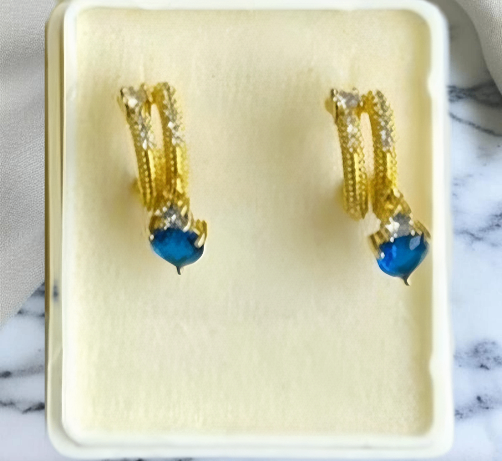 • Descripción corta: Aros dorados con corazón azul colgante y cristales claros.