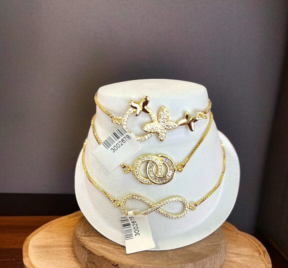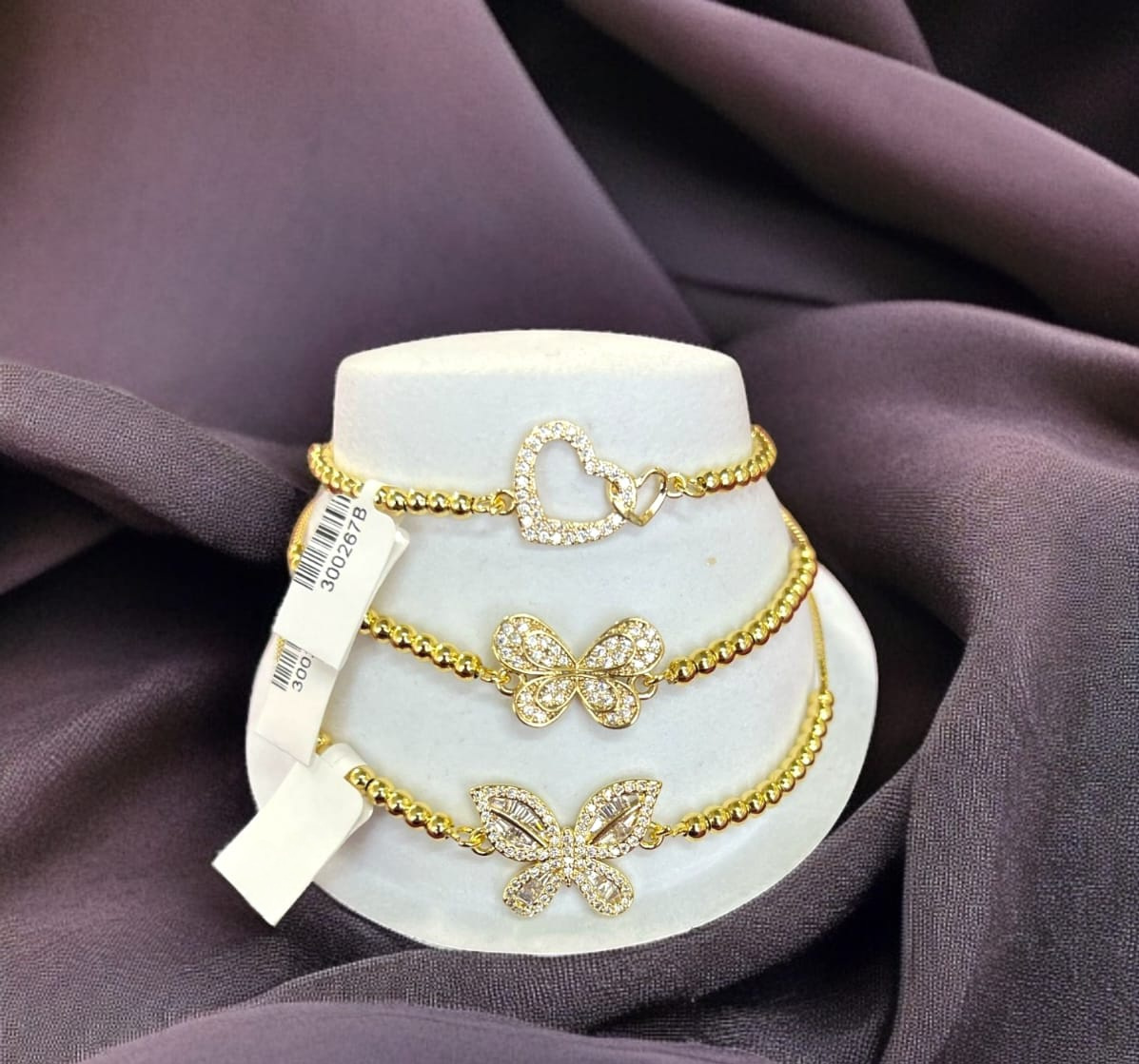 La colección Destellos de Oro celebra la feminidad y el encanto con tres pulseras únicas, elaboradas en chapa de oro de 18 quilates. Cada pieza está adornada con dijes brillantes: un corazón que simboliza amor eterno, y dos mariposas que evocan libertad y transformación. Las cuentas doradas aportan textura y elegancia, mientras los detalles en pavé añaden un toque de lujo.