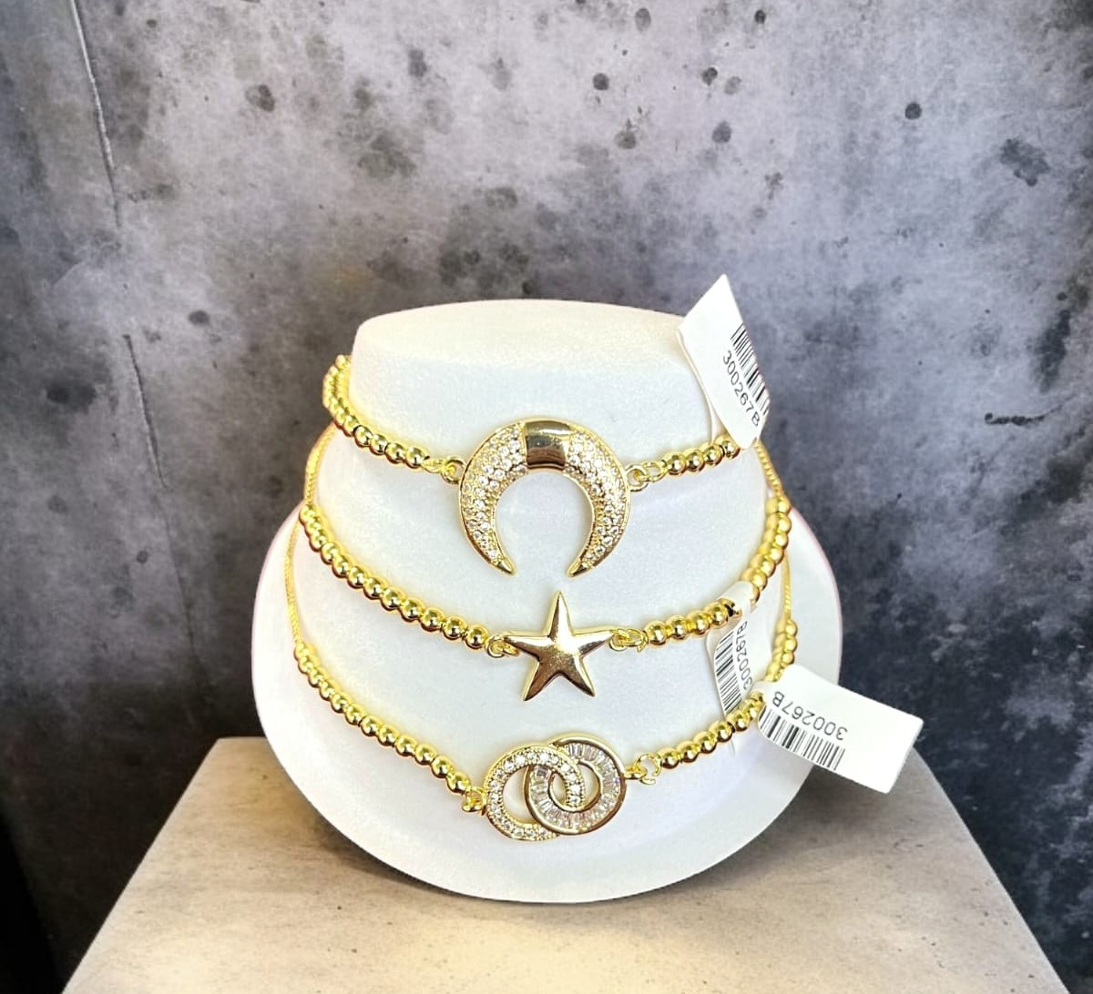 Pulseras en chapa de oro de 18 quilates con dijes brillantes con diferentes formas. Diseño delicado, ideal para regalar o lucir con estilo.