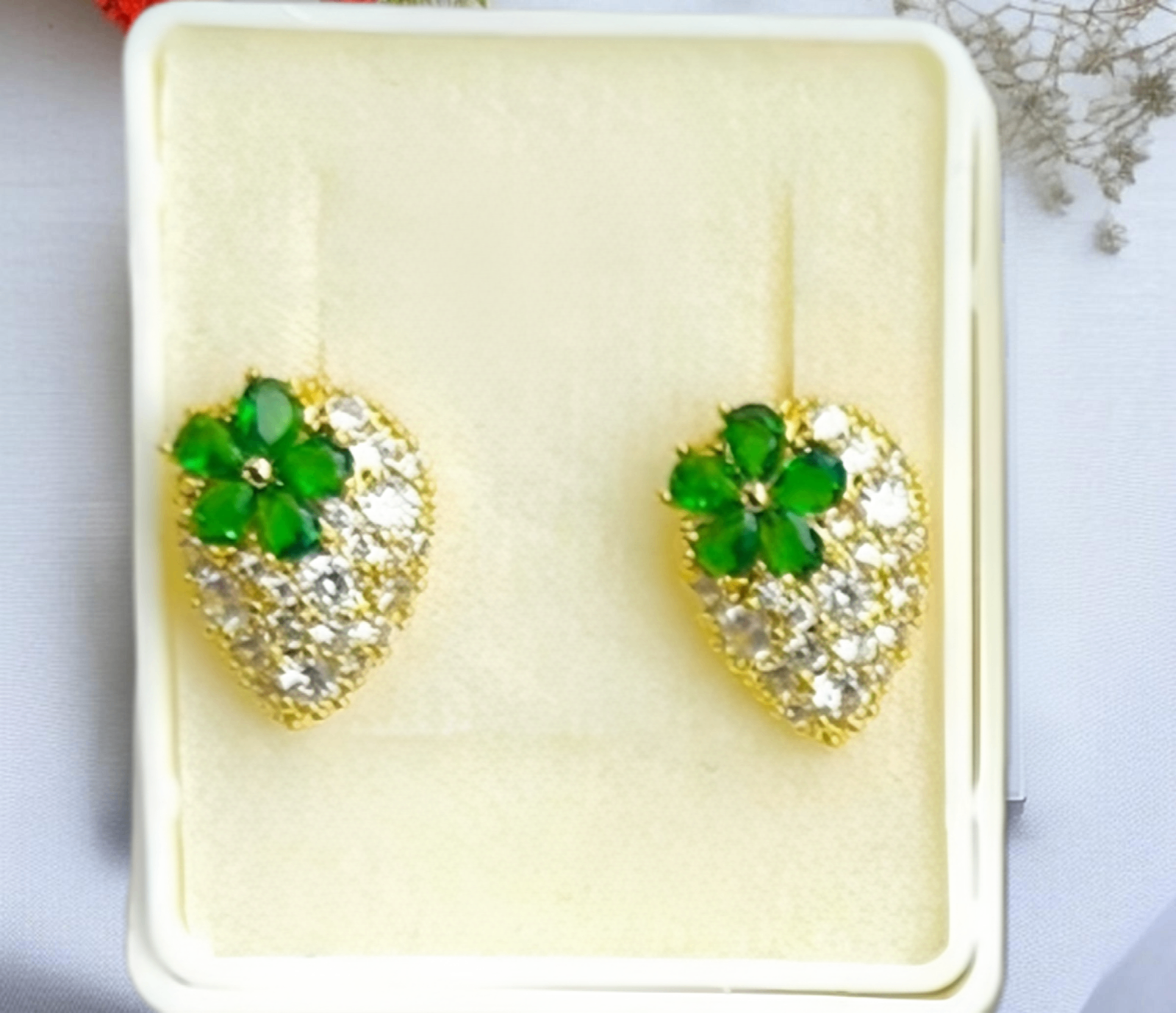 • Lágrimas doradas con cristales claros y flores verdes.