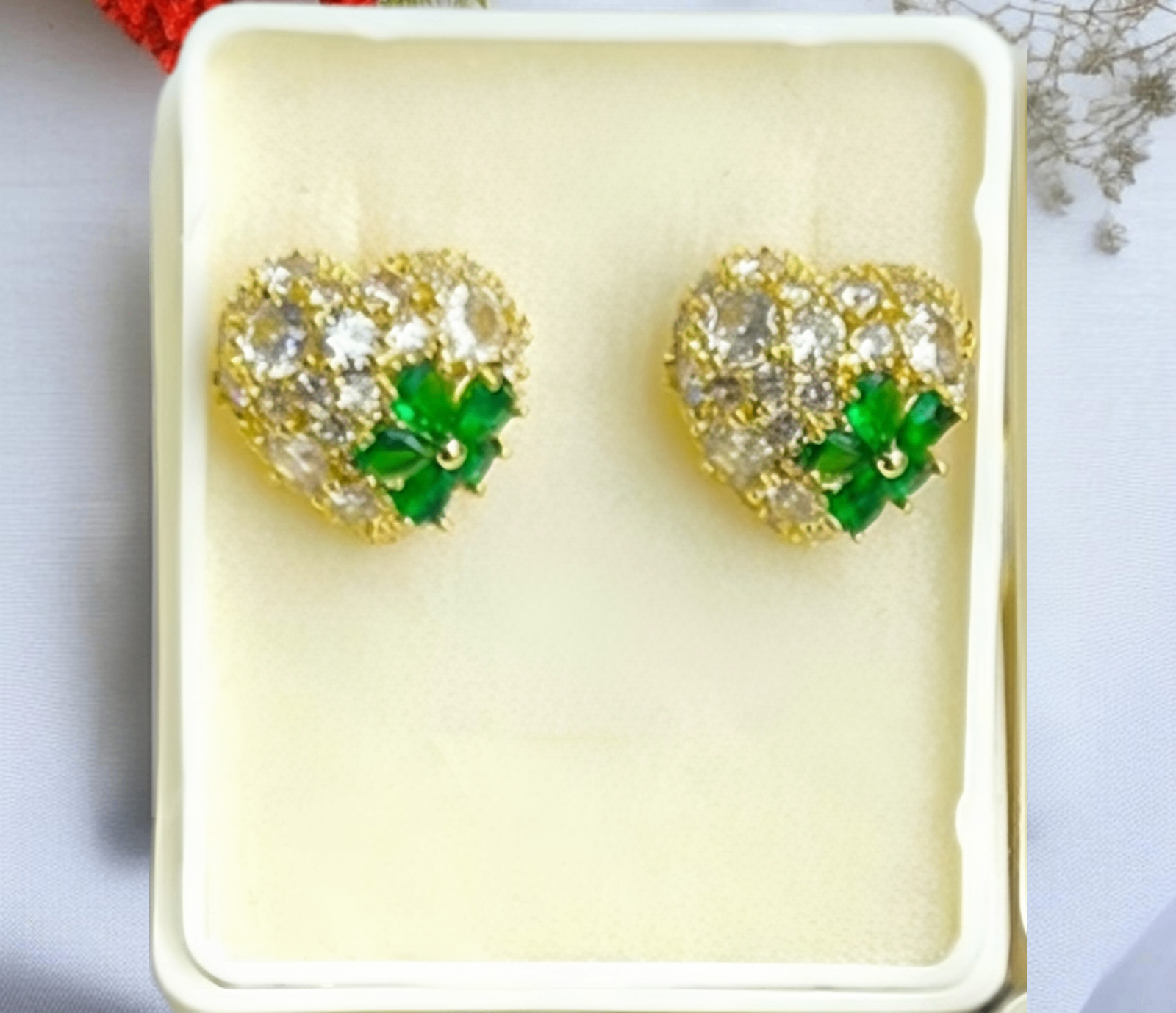 • orazones dorados con cristales y flor verde central.