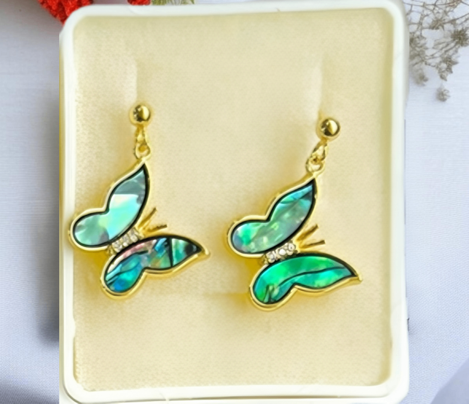 • Mariposas doradas con alas en tonos turquesa y verde.