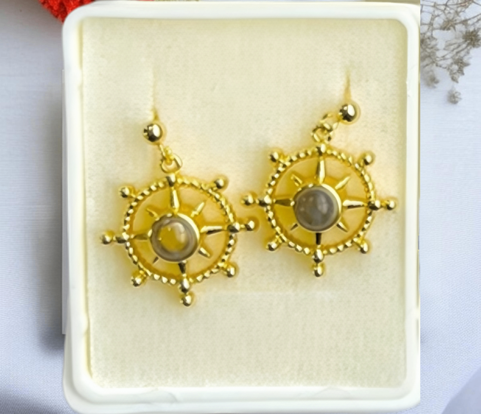 • Aros dorados con diseño tipo brújula y piedra central.