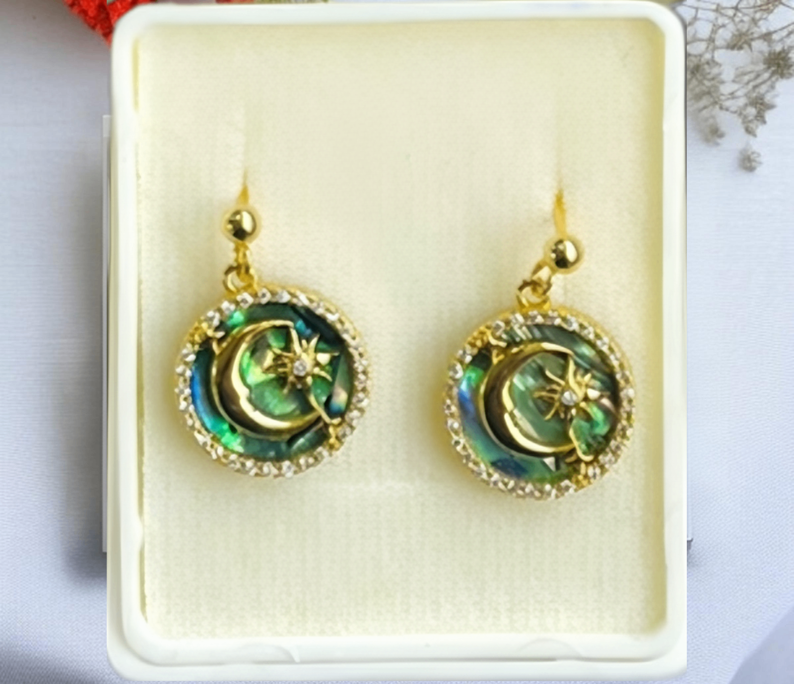 • Aros dorados con luna y estrella en tonos verdes y dorados.