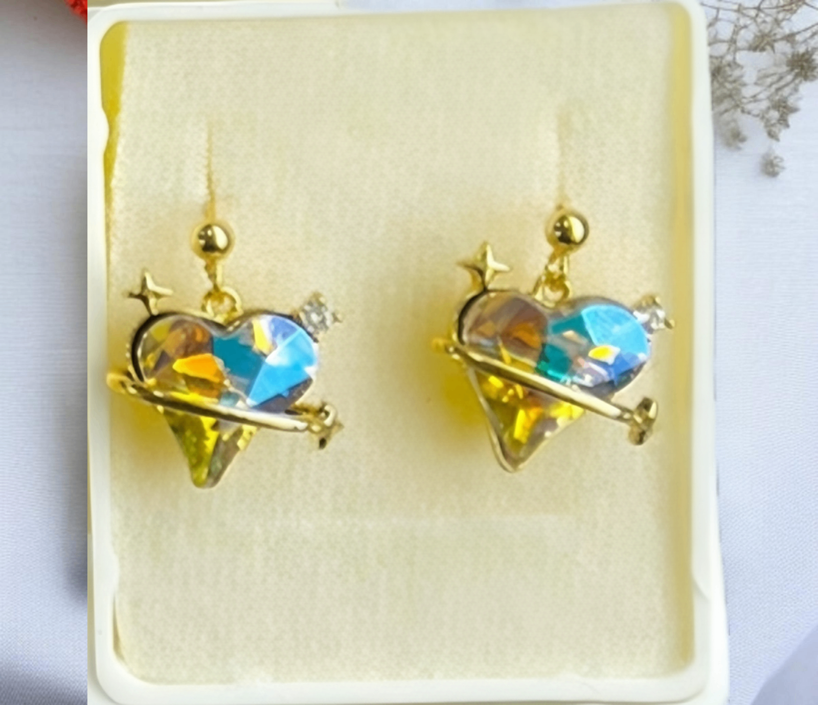 • Corazones dorados con cristal azul y amarillo en marco de alambre.