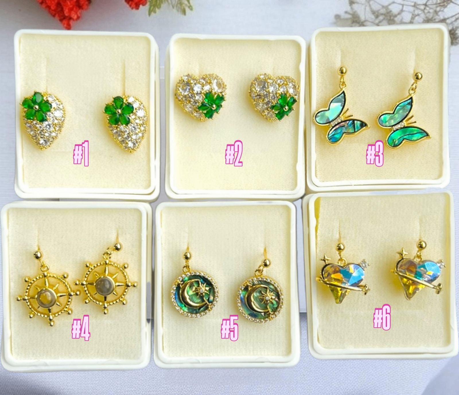 Butterfly Mirage, Emerald Bloom Drops, Golden Compass, Heart of Ivy, Moonlight Orbit, Ocean Heart