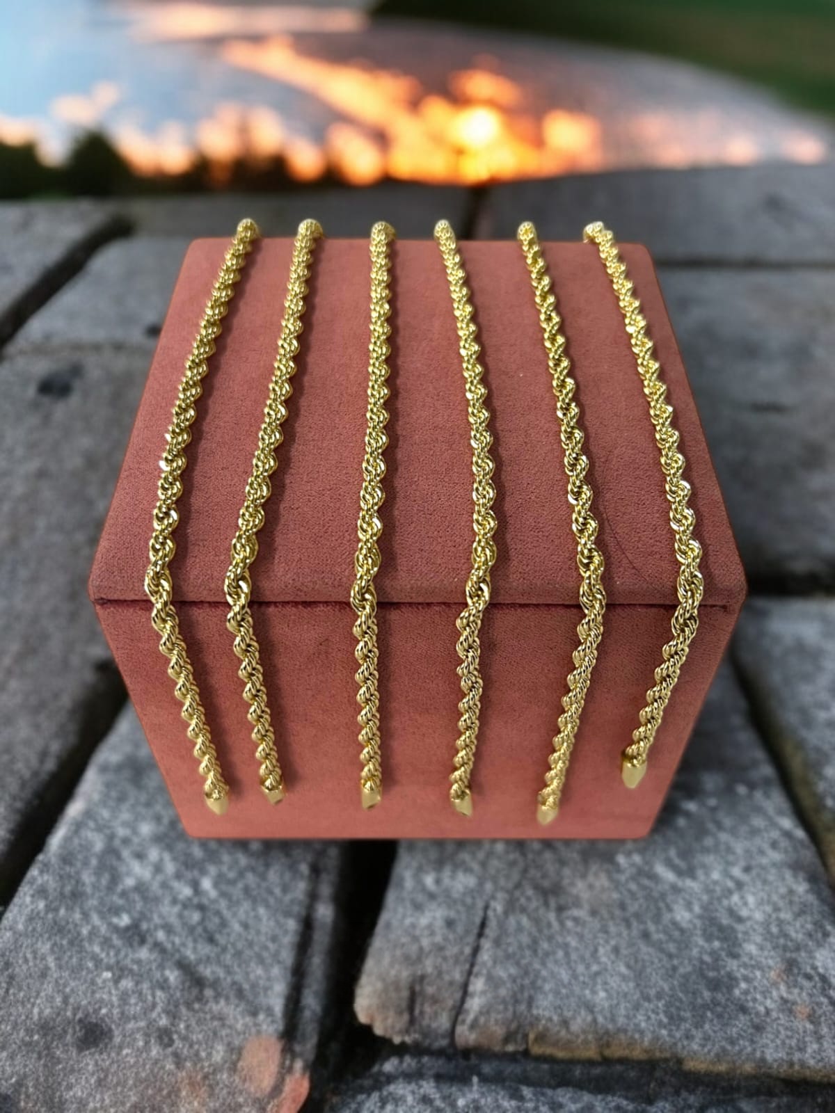 El Collar Aureus está elaborado en chapa de oro de 18 quilates y mide 45 cm. Su diseño de cadena retorcida, también conocida como “rope chain”, se compone de eslabones entrelazados que generan un efecto trenzado con gran brillo y textura.