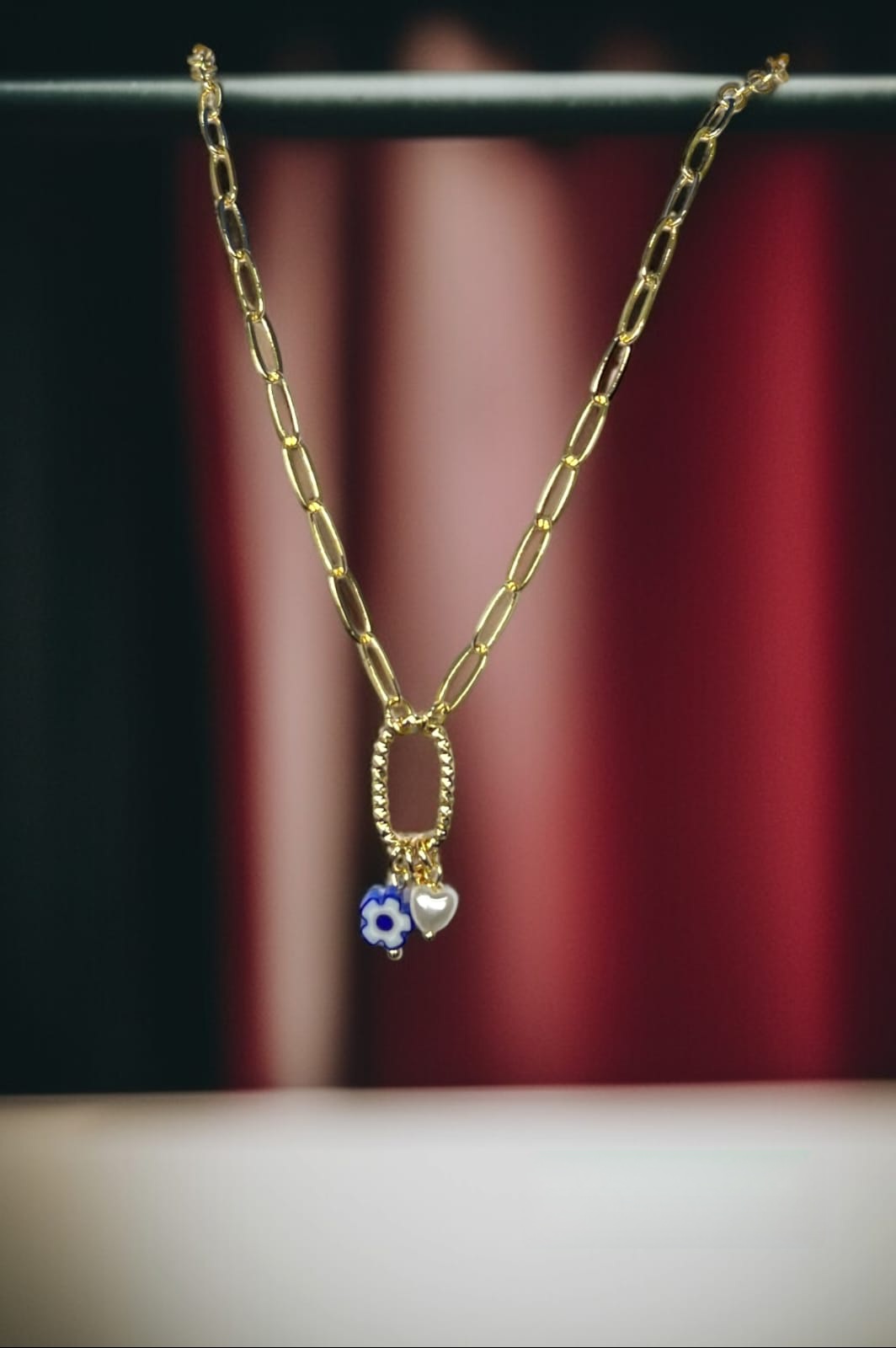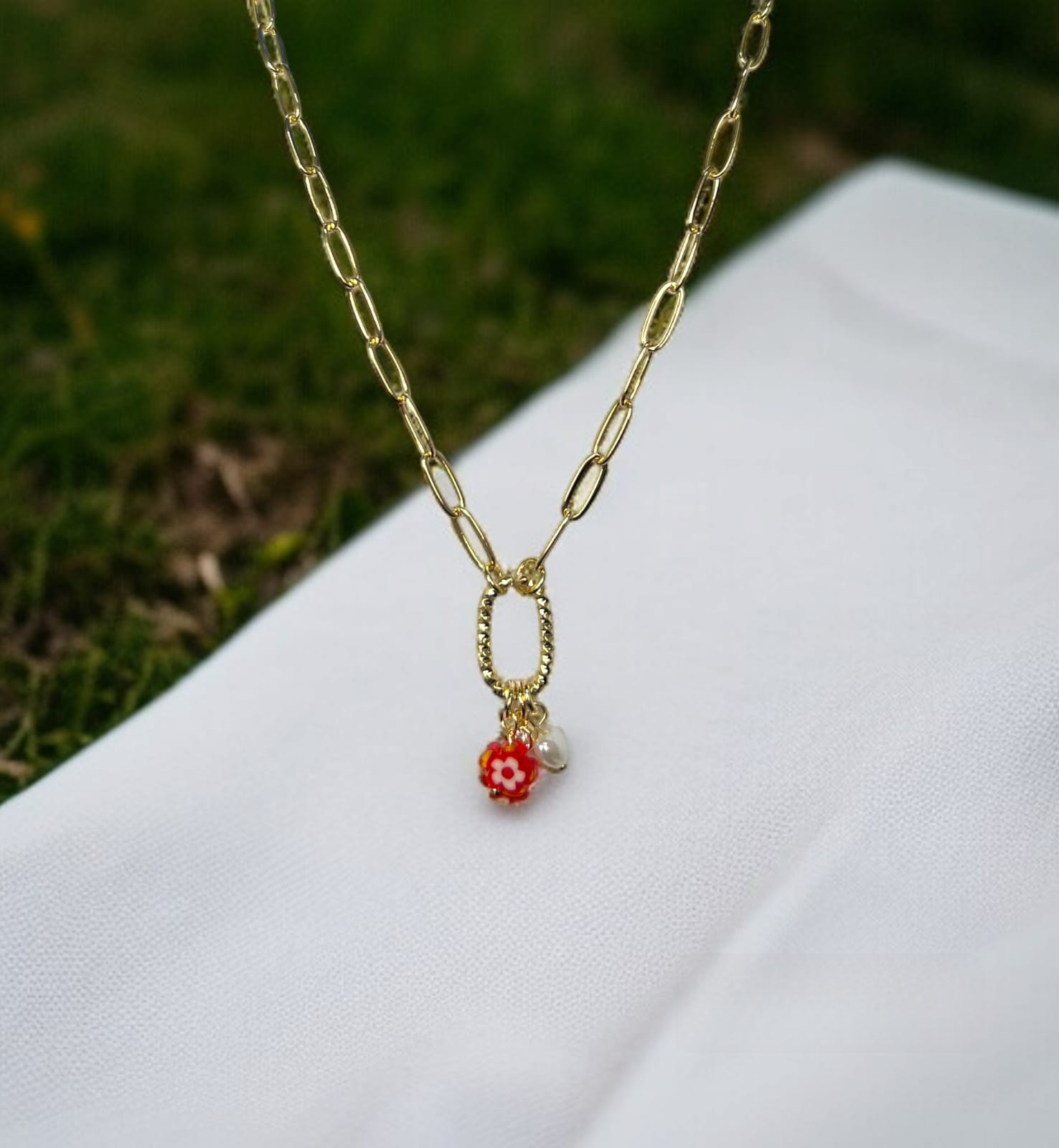 En el centro destaca un dije en forma de flor esmaltada, símbolo de frescura y alegría, acompañado de una delicada perla sintética en forma de corazón que aporta un toque romántico y elegante.