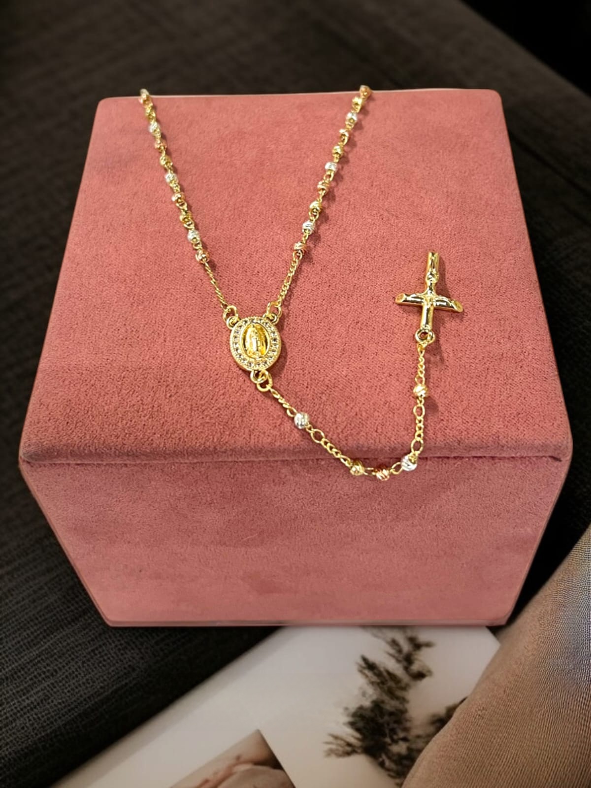 La alternancia de los tres colores de oro simboliza unidad, fe y plenitud espiritual, mientras que la medalla y el crucifijo convierten esta pieza en un recordatorio de protección y devoción. Ideal para quienes buscan un accesorio con profundo significado religioso y un acabado refinado.