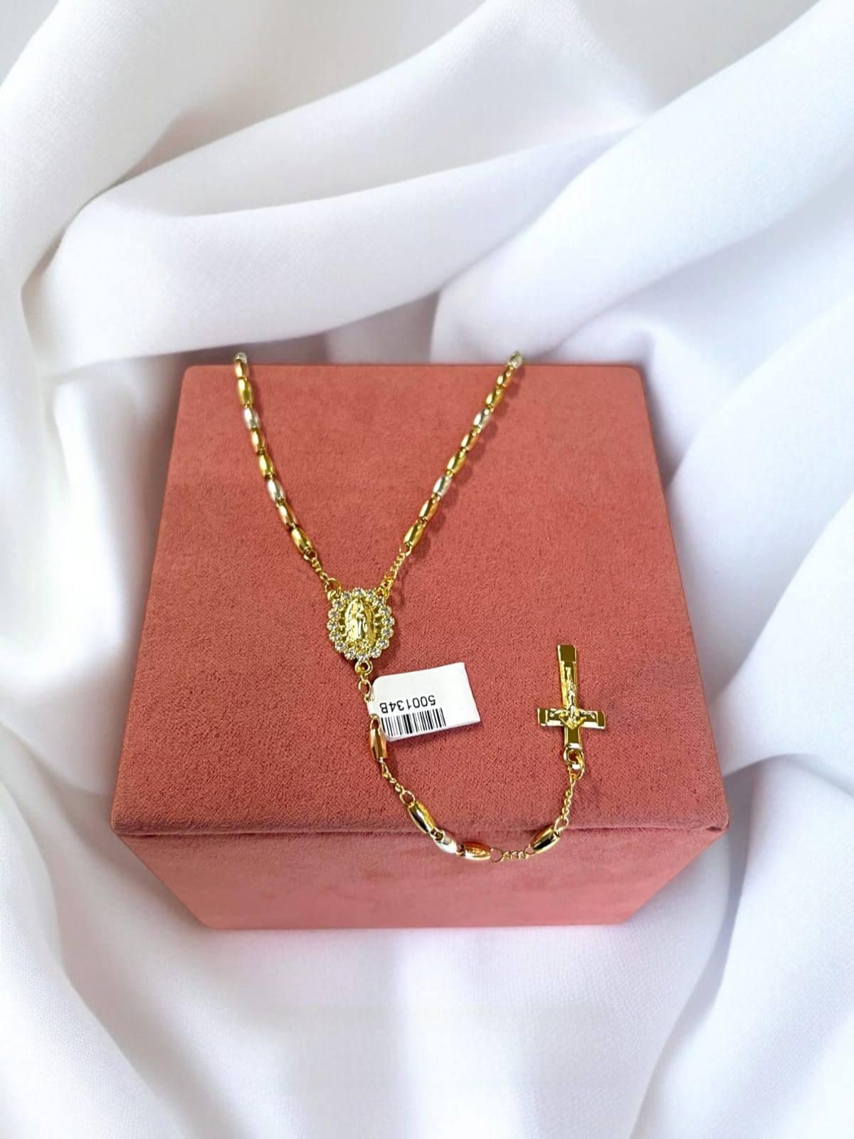 El Collar Rosa Mística está elaborado en chapa de oro de 18 quilates en tres tonos: rosa, blanco y dorado, y mide 60 cm. Su diseño presenta una medalla de la Virgen de Guadalupe finamente detallada, rodeada por un halo de cristales que realzan su figura con destellos luminosos.