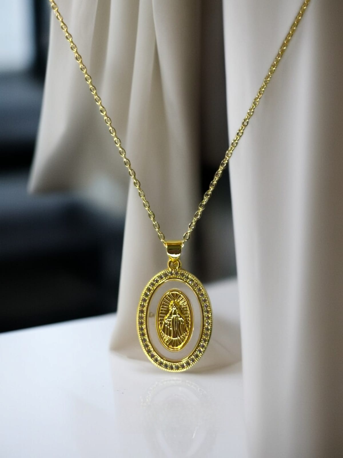 El Collar Zapopana está elaborado en chapa de oro de 18 quilates y presenta una medalla ovalada con la imagen de la Virgen de Zapopan, Patrona de Guadalajara y símbolo de fe y protección. La medalla está rodeada por un halo de cristales que realzan su brillo y aportan un toque de elegancia.