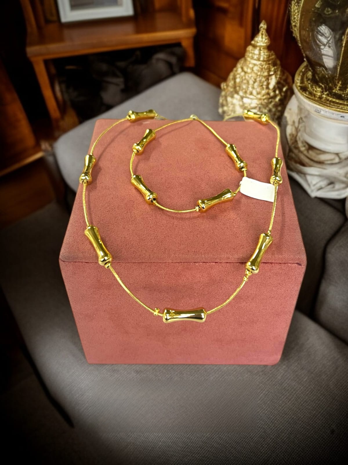 Conjunto de choker y pulsera en chapa de oro 18k. Diseño estilo bambú, elegante y atemporal.