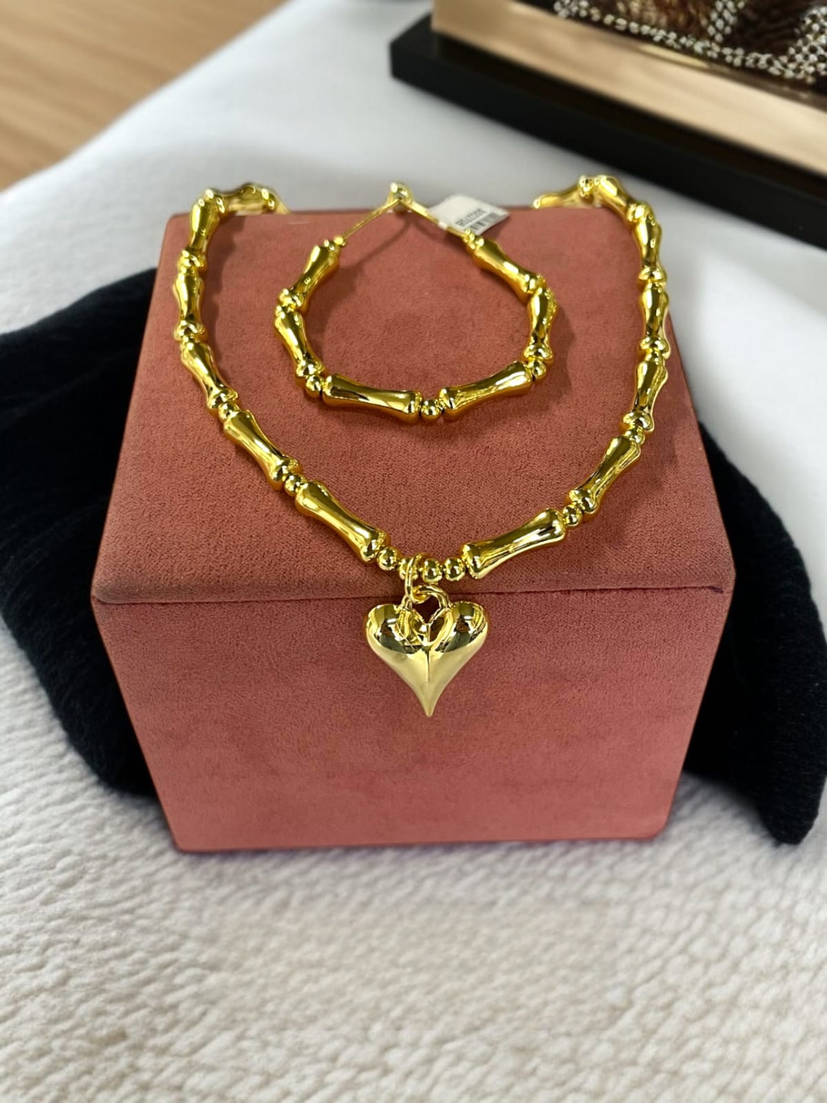 El Conjunto Corazón Eterno está elaborado en chapa de oro de 18 quilates y se compone de un choker y una pulsera con diseño de eslabones estilo bambú, ambos adornados con un dije de corazón.