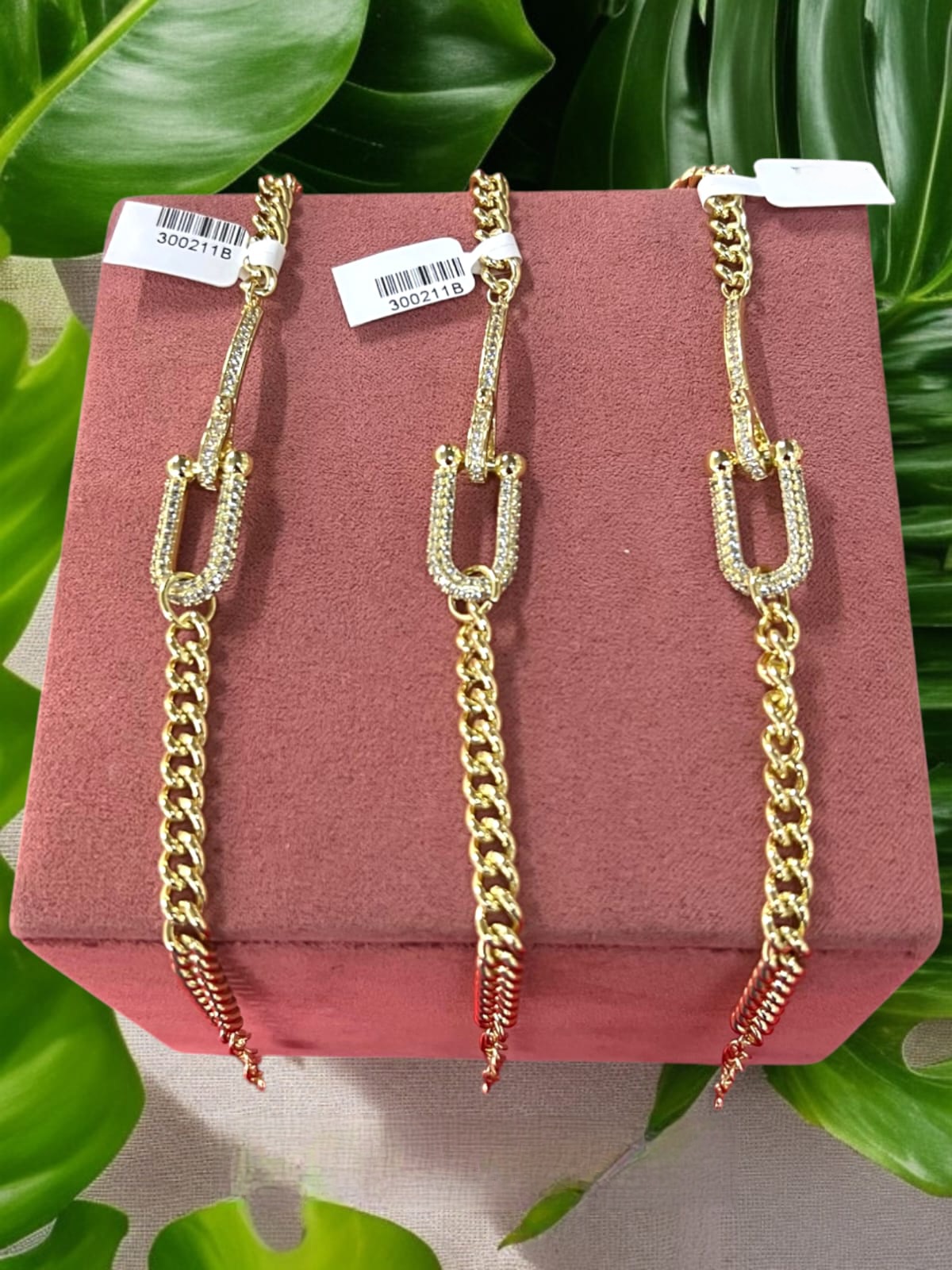 Fabricada en chapa de oro de 18 quilates, su longitud de 21 cm ofrece un ajuste cómodo y seguro. Es ideal para lucir sola o como pieza central en una combinación de accesorios dorados.