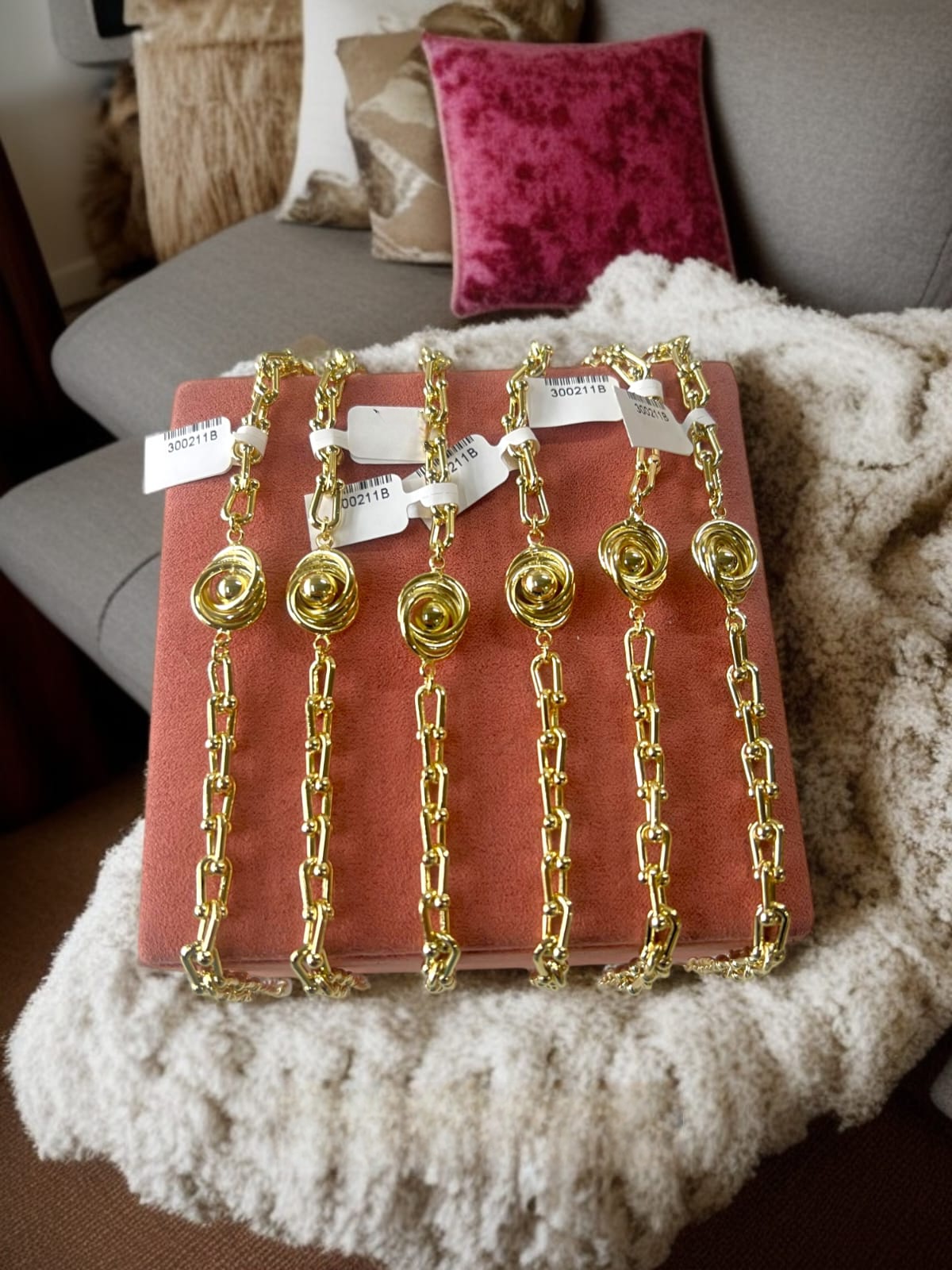 La Pulsera Estilo Medallón de 22 cm en chapa de oro 18k es una pieza que resalta por su diseño imponente y sofisticado. Sus eslabones alargados con detalles esféricos se complementan con un medallón central en forma de espiral, que aporta un toque único y llamativo.