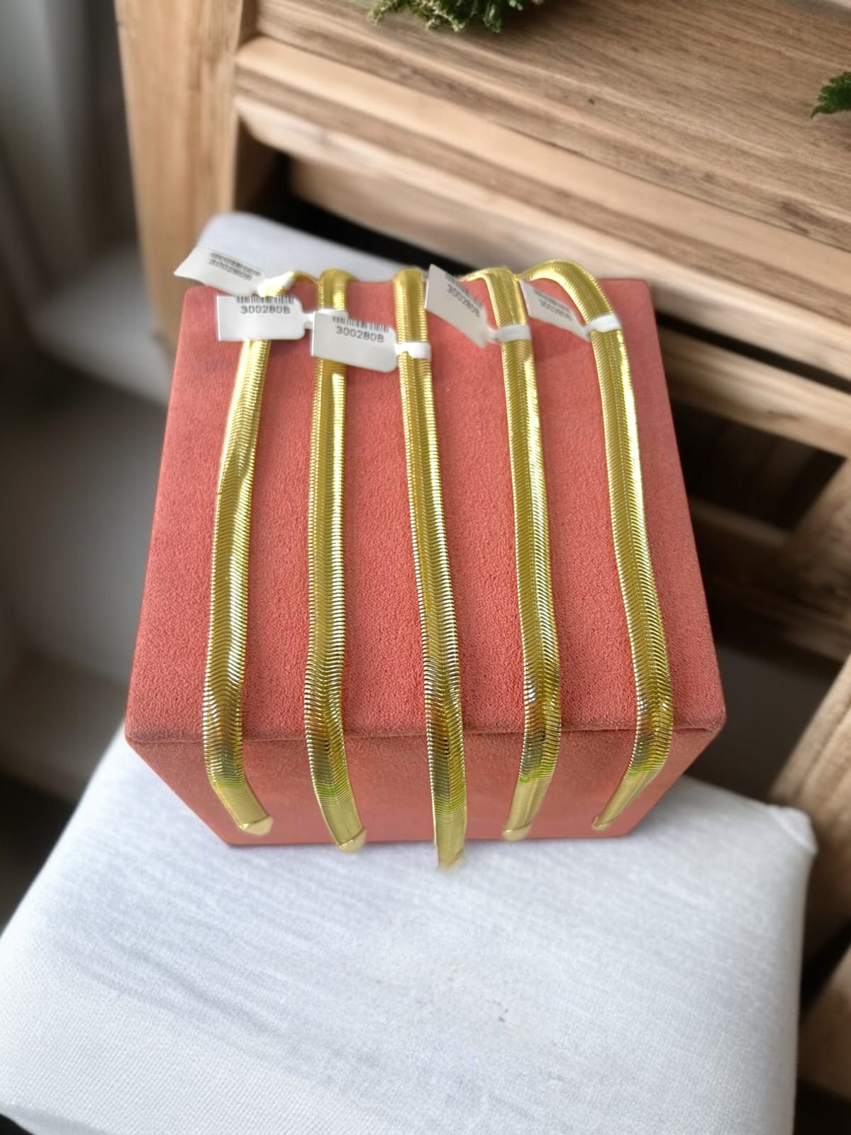 La Pulsera Estilo Serpiente de 19 cm en chapa de oro 18k es una joya elegante y versátil que destaca por su diseño liso y continuo, similar a una serpiente, lo que le otorga un brillo uniforme y un acabado impecable.
