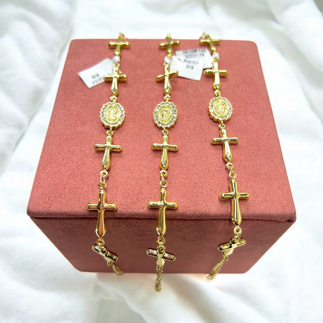 Pulsera de chapa de oro 18k, 17 cm + extensión. Medalla de la Virgen y cruz. Fe y elegancia en un diseño atemporal.