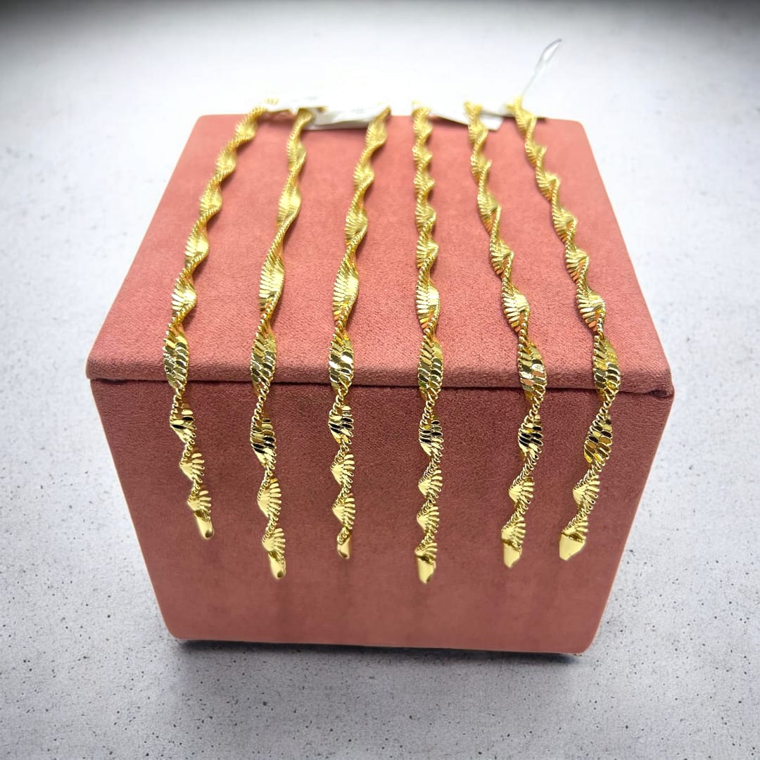 La Pulsera Hélice está elaborada en chapa de oro de 18 quilates y mide 19 cm, ofreciendo un diseño sofisticado que combina dinamismo y elegancia. Su cadena presenta un trenzado en espiral con segmentos lisos y texturizados que generan un juego de luces único, evocando movimiento y energía en cada detalle.