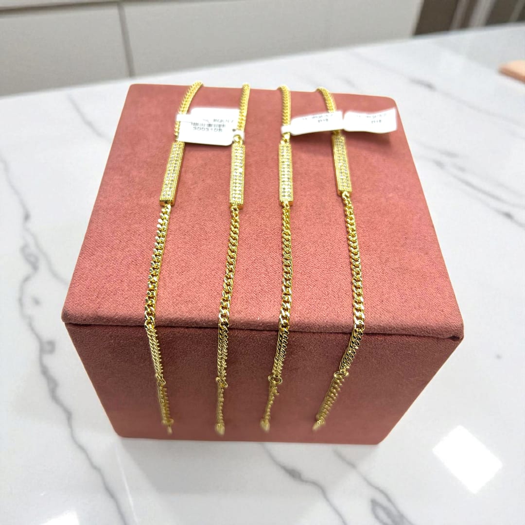 La Pulsera Lux está elaborada en chapa de oro de 18 quilates y mide 17 cm, con extensión ajustable para un calce perfecto. Su diseño combina una cadena tipo curb de eslabones planos y pulidos con un segmento central rectangular incrustado de cristales brillantes, que reflejan la luz con cada movimiento.