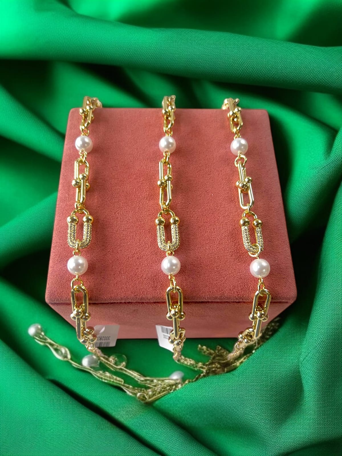 · Pulsera de chapa de oro con perlas sintéticas. 19 cm de elegancia luminosa y diseño entrelazado.