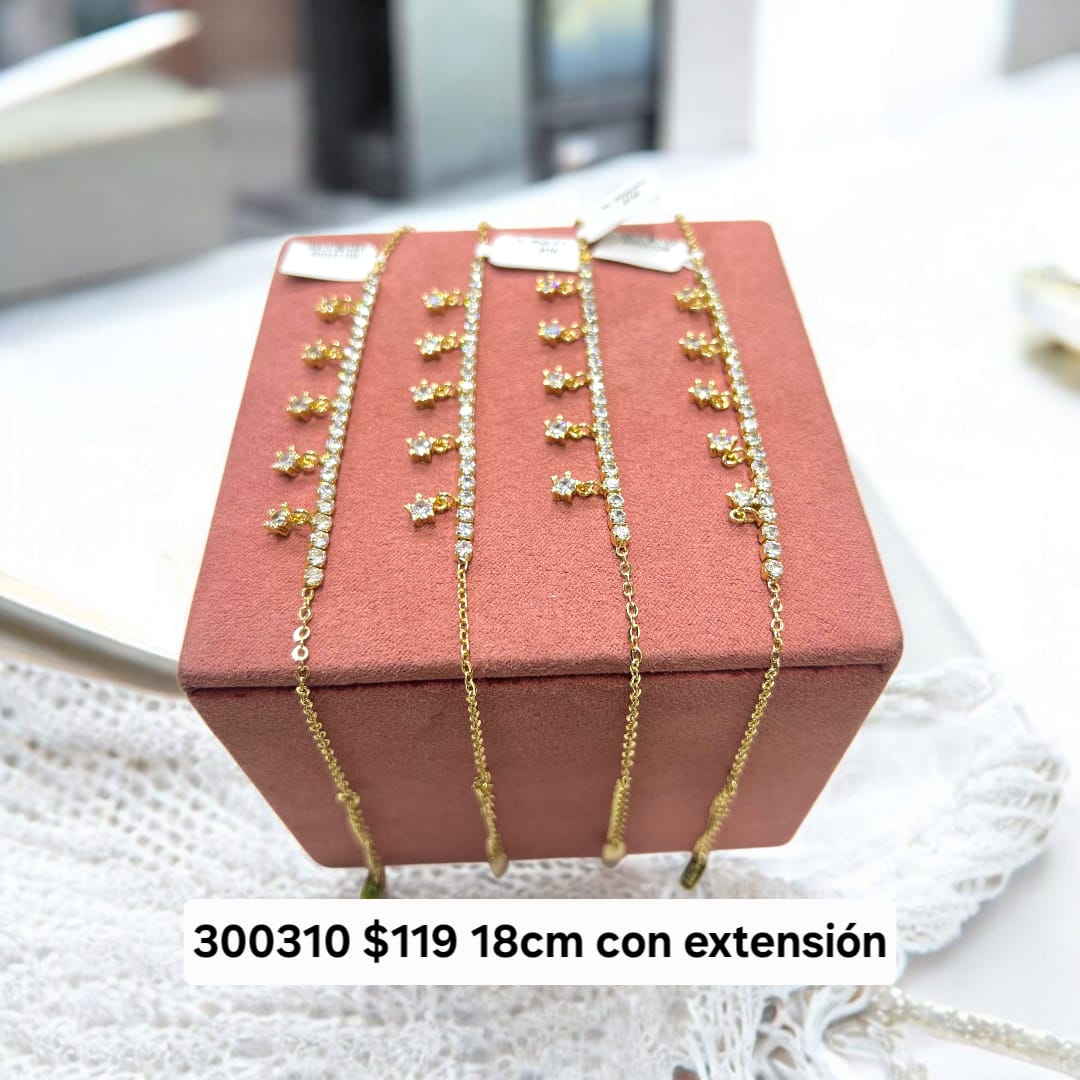 La Pulsera Stellae está elaborada en chapa de oro de 18 quilates y mide 17 cm, con extensión ajustable para un calce cómodo. Su diseño delicado presenta dijes en forma de estrellas, cada una engastada con cristales brillantes que capturan la luz en cada movimiento.